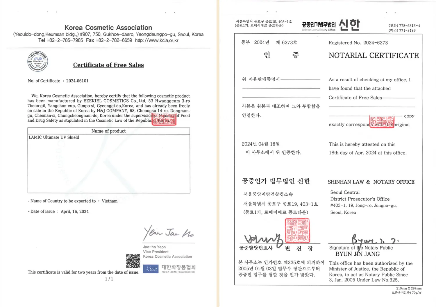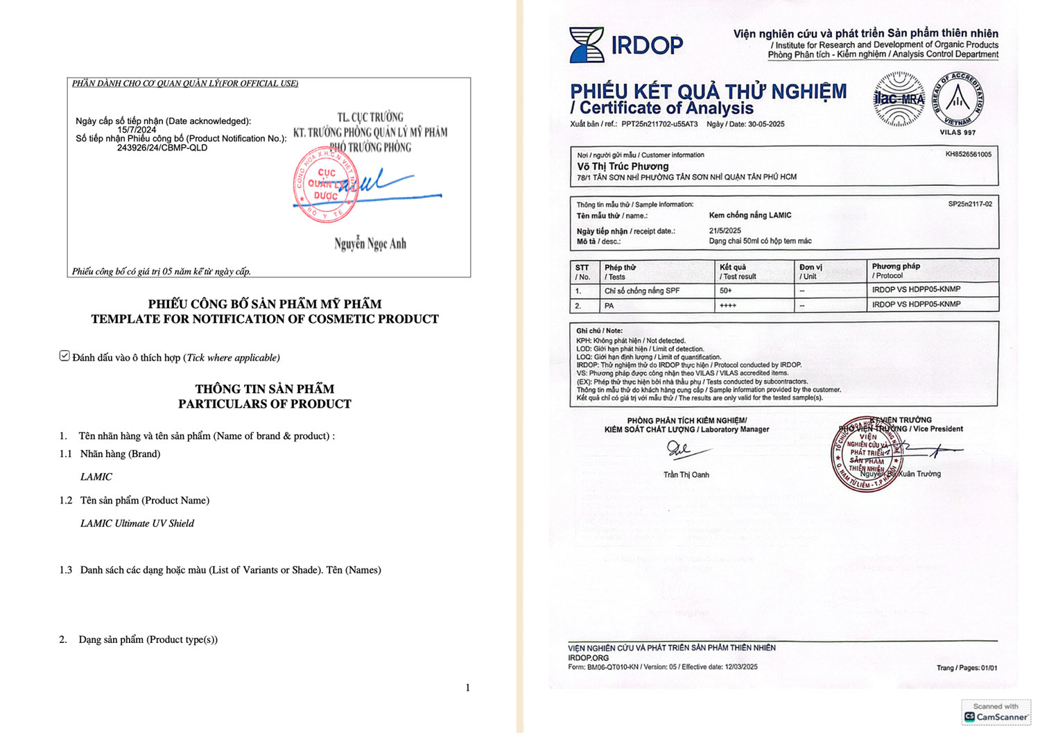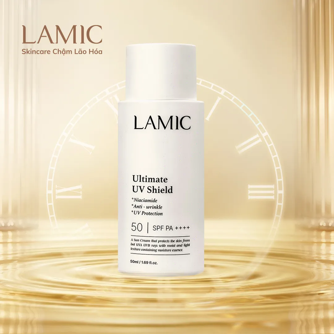 - Kem chống nắng Ultimate UV Shield LAMIC đạt SPF 50+ PA++++, giúp bảo vệ da trước tia UVA và UVB, nguyên nhân chính gây sạm da, lão hoá sớm và tổn thương da do ánh nắng mặt trời.